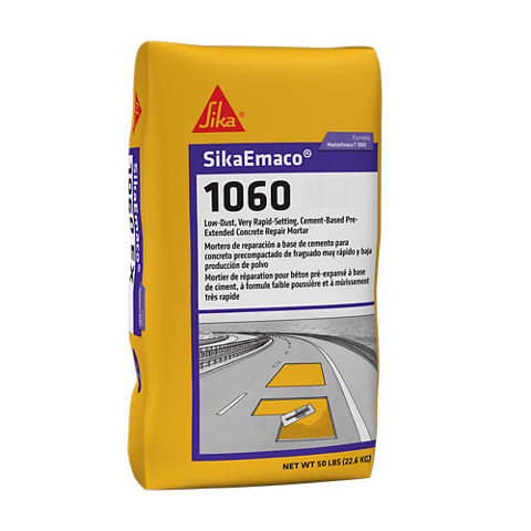 SikaEmaco®-1060 is a one-component, shrinkage-compensated, very rapid-setting, cement-based mortar. It is designed for repairing horizontal concrete surfaces where high early strength gain is required.