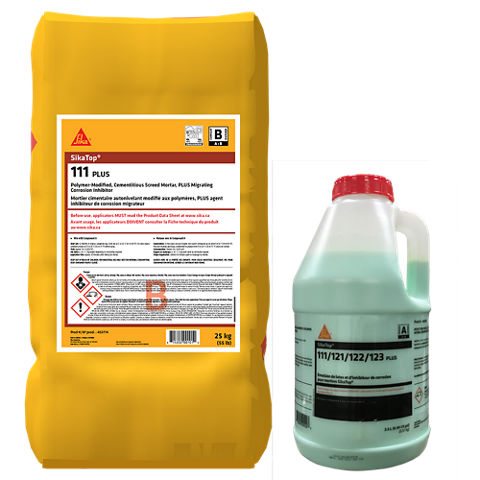 SikaTop®-111 Plus is a polymer-modified, with migrating corrosion inhibitor added, cementitious, 2-component, fast-setting, free-flowing mortar. It self-levels on flat slabs, moves easily into “hard to get” places under equipment and supports, between piping pillars and block-outs.