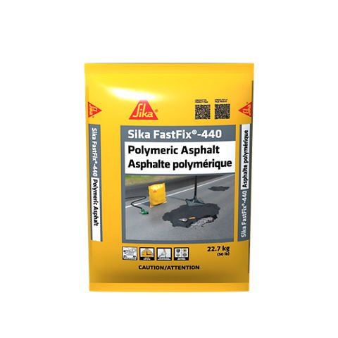 High performance, extremely stable cold asphalt. It offers excellent workability at low temperatures, and also excellent adherence in wet conditions. Once activated with water, the polymers found in Sika FastFix®-440 Polymeric Asphalt provides a permanent repair. It’s a revolutionary high performing and flexible product aimed at the repair of asphalt and reactive concrete. Sika FastFix®-440 Polymeric Asphalt contains a viscosity modifier having no concentration of volatile organic compound (V.O.C.). Sika FastFix®-440 Polymeric Asphalt may be utilized in all weather conditions (cold, rain, snow) twelve months a year.